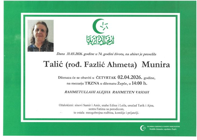 HomeDženazeDženaza – Munira Talić Urednik1. Aprila 2026. 9:07 KM_C3320i Q76 CATEGORIES Dženaze Share ThisAUTHORUrednik