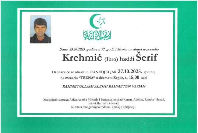 HomeDženazeDženaza – Šerif Krehmić Urednik26. Oktobra 2025. 7:50 KM_C3320i Q76 CATEGORIES Dženaze Share ThisAUTHORUrednik